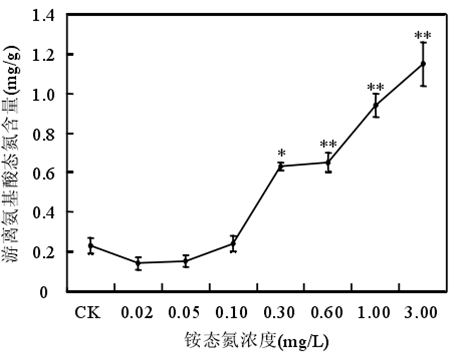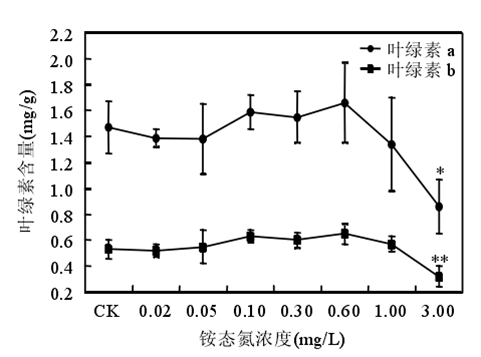 銨態(tài)氮濃度低于 0.60mg/時(shí)苦草生長良好,濃度大于或等于 1.00mg/L 時(shí)苦草的光合能力受到抑制、代謝受到干擾。苦草對銨態(tài)氮最敏感的生理生化指標(biāo)是葉片中游離氨基酸態(tài)氮含量。銨態(tài)氮作為沉水植物的一種營養(yǎng)物質(zhì),當(dāng)其含量較低時(shí),植物由于營養(yǎng)缺乏誘導(dǎo)產(chǎn)生自由基。