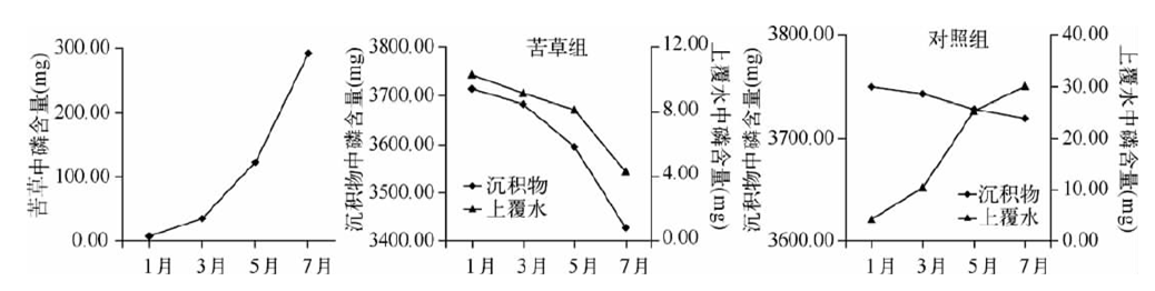 苦草對水體營鹽的去除率隨生物量的增加不斷增大,當(dāng)生物量達(dá)到 2380.00g時(shí),去除率放緩。苦草腐敗釋放的磷大部分被底泥吸附,少量進(jìn)入水體。草腐敗分解具有階段性,前36d分解迅速,以后分解速率顯著下降。