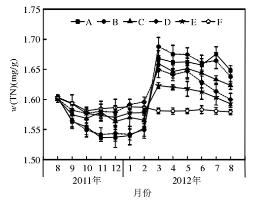 在富營養(yǎng)狀態(tài)下(N4 mg/ LP0.2 mg/ L)不同比例硝態(tài)氮(NO-3-N)和尿素氮(Urea-N)對苦草(Vallisneria atans)的生理影響:隨著培養(yǎng)液中尿素氮比例的上升,生物量和硝酸還原酶活性,依次降低;POD和脲酶活性先升高后降低.研究表明,添加一定量的硝態(tài)氮可以促進(jìn)苦草的生長,但當(dāng)環(huán)境中尿素含量逐漸增加時(shí)會對苦草產(chǎn)生一定的脅迫作用,影響苦草的正常生長.從本實(shí)驗(yàn)研究結(jié)果綜合來看,硝態(tài)氮(NO-3-N)和尿素氮(Urea-N)對苦草產(chǎn)生脅迫影響的閾值比為1 1.此時(shí)TN4 mg/ LNO-3-NUrea-N均為2 mg/ L