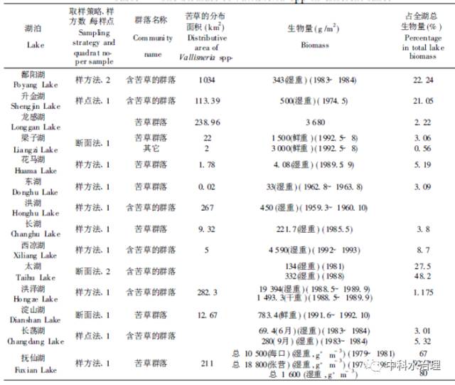 在很多湖泊植被調(diào)查工作中都對苦草群落或含苦草的群落生物量進(jìn)行了測定(見下圖)。從表中可以看出,最高和最低生物量之間存在上千倍的差異。這一方面是因?yàn)檎{(diào)查對象尚包括其它種類,而非苦草本身; 另一方面,也是由于調(diào)查方法本身所致: