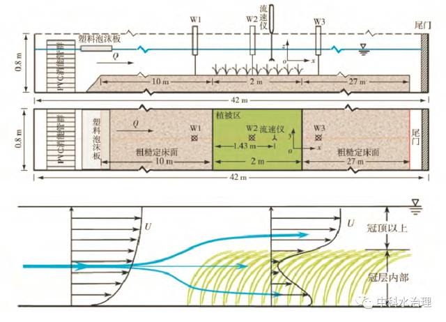 1) 冠層以上,水流不受苦草冠層的影響,時(shí)均流速呈對數(shù)分布; 冠層內(nèi)部,由于冠層阻流面積在垂線分布上存在差異,冠層內(nèi)時(shí)均流速呈逆梯度分布,且在床面附近出現(xiàn)局部流速最大值。